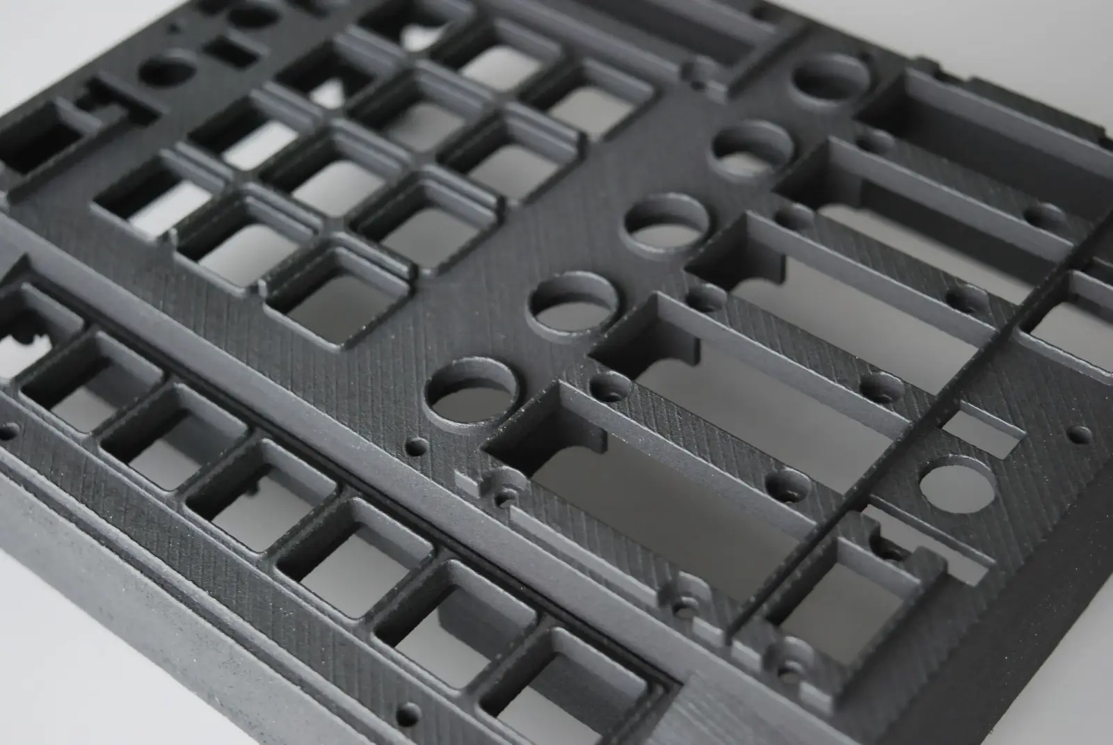 Drukowanie SLS polega na spiekaniu przez laser sproszkowanego poliamidu Pa12 na warstwie grubości 0,12mm co pozwala na osiągnięcie dokładności wymiarowej +/-0,3%. Technologia proszkowa nie wymaga podpór wydruku, więc nie ma ograniczeń co do geometrii detali. Spiekanie laserowe pozawala na osiągnięcie wyjątkowo dużej izotropowości materiału, osiągając przy tym do 90% wytrzymałości elementów z Pa12 wykonanych metodą formowania wtryskowego. Druk proszkowy SLS charakteryzuje się mikro porowatością struktury oraz chropowatością powierzchni w stosunku do wtrysku czy druku FDM i SLA.